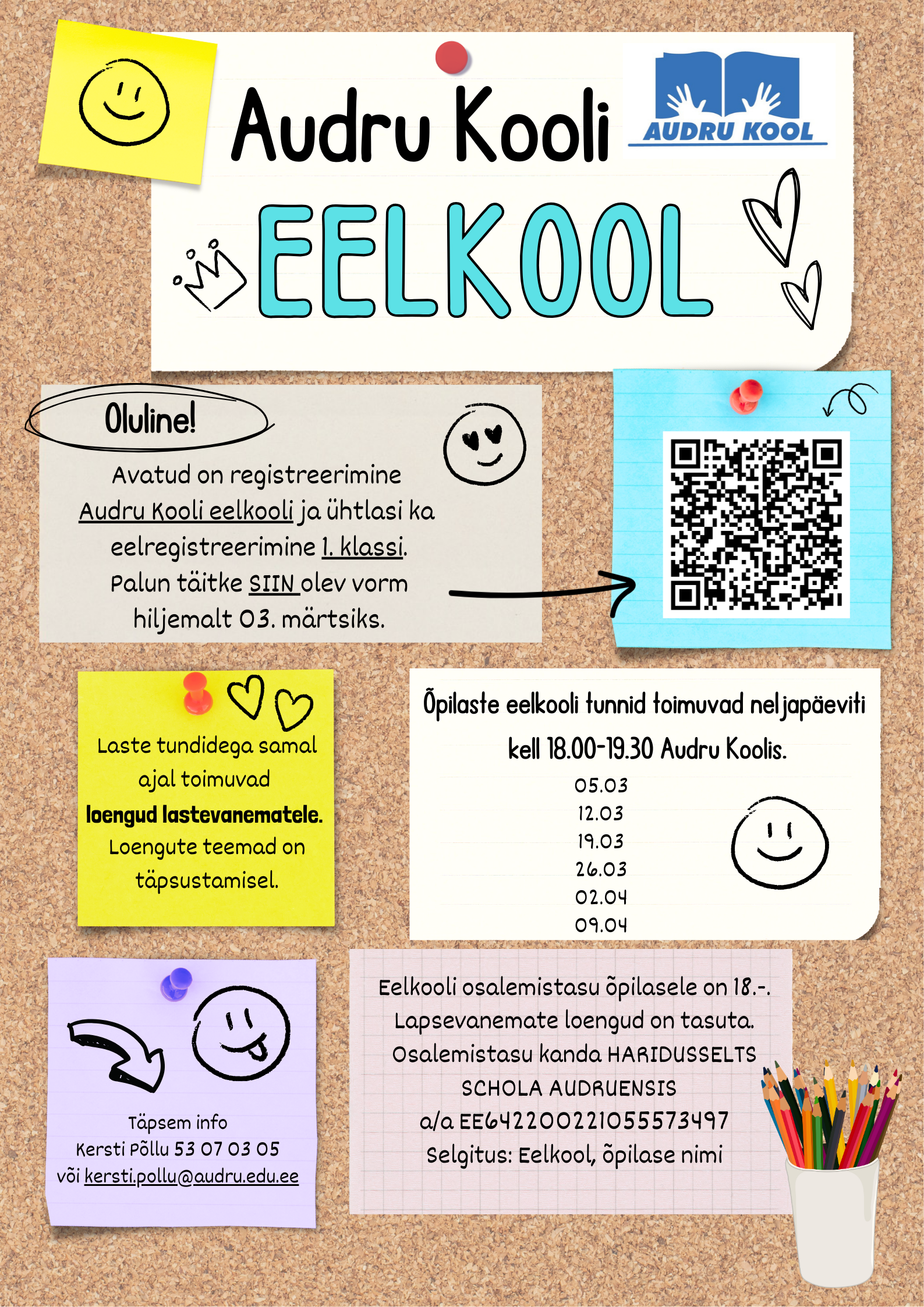 Märtsis alustame taas eelkooliga Audru Koolis. Avatud on registreerimine eelkooli ning ühtlasi ka eelregistreerimine 1. klassi. Eelkooli tunnid toimuvad neljapäeviti kell 18.00–19.30 Audru Koolis. Samal ajal on lapsevanematel võimalus osaleda tasuta loengutes. Palume registreerimisvorm täita hiljemalt 3. märtsiks. Tule koos lapsega ja alusta kooliteed kindla ja rõõmsa sammuga.