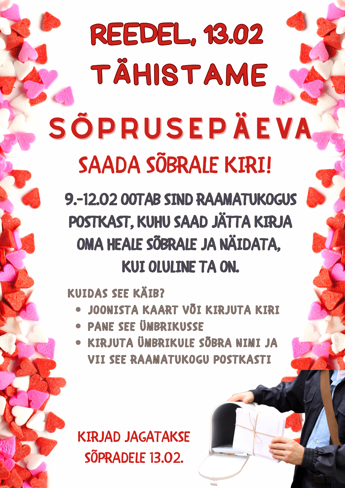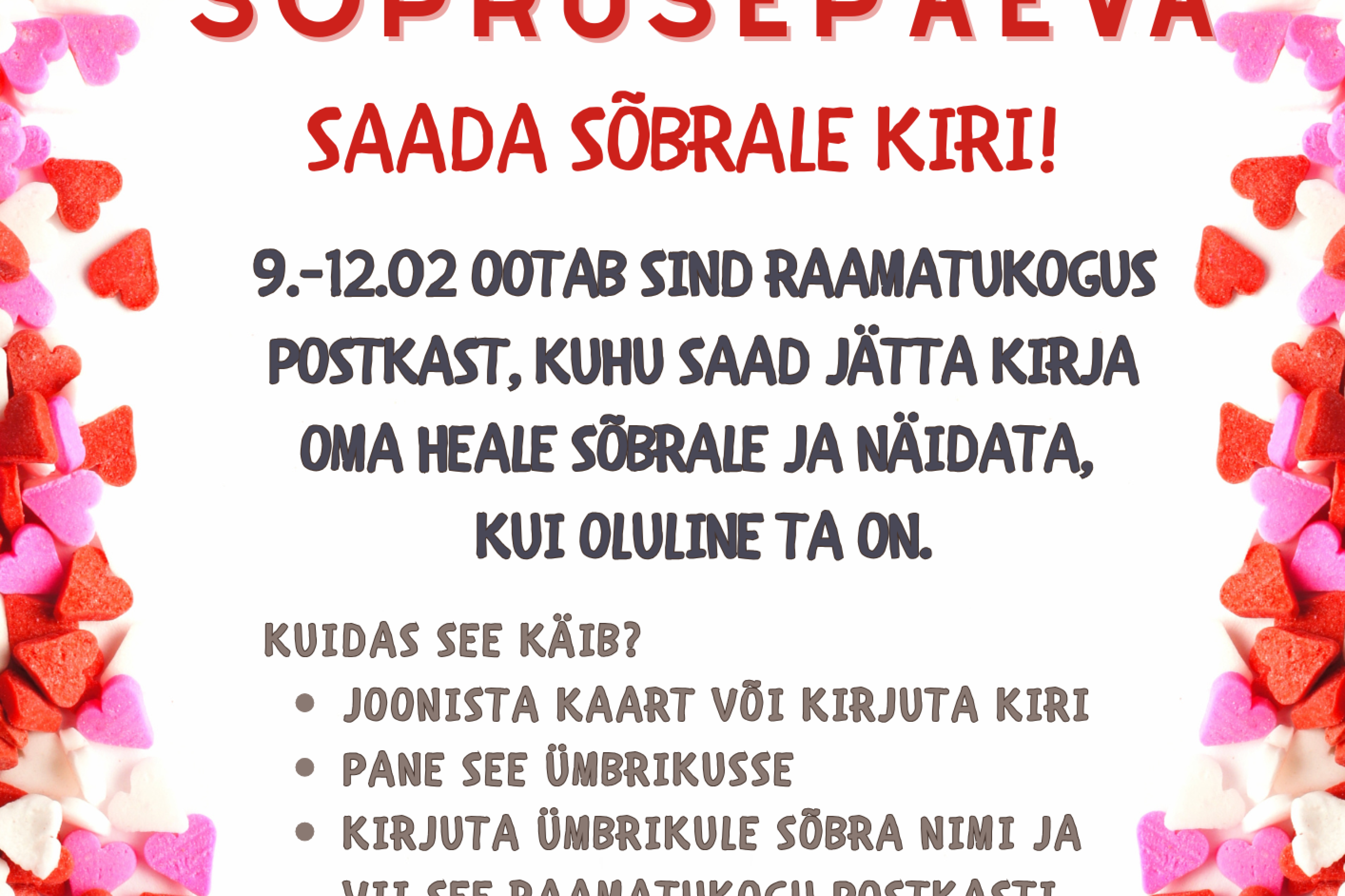 Sõbrapäev on peagi käes ja on hea hetk märgata neid, kes on meie kõrval iga päev. Reedel, 13. veebruaril tähistame sõbrapäeva ning kutsume kõiki saatma oma heale sõbrale ühe sooja ja südamliku kirja. 9.–12. veebruarini ootab raamatukogus postkast, kuhu saab jätta kirja või kaardi, et öelda aitäh, jagada häid mõtteid või lihtsalt rõõmu valmistada. Kirjad jõuavad sõpradeni 13. veebruaril. Mõni sõna paberil võib tähendada rohkem, kui oskame arvata. Tule ja tee kellelegi päev helgemaks!
