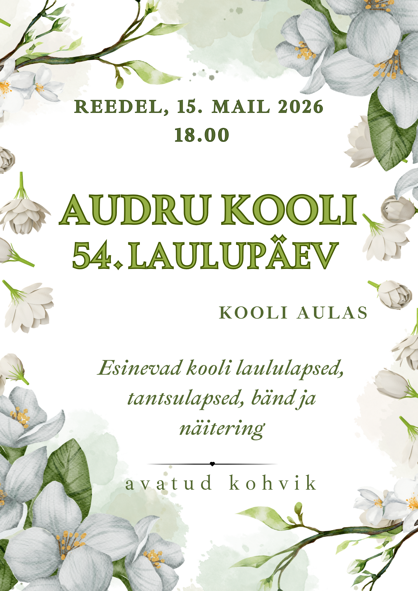 Anname juba varakult teada, et Audru koolis on tulemas üks väga eriline õhtu. Reedel, 15. mail kell 18 toimub kooli aulas Audru kooli 54. laulupäev. See on üks meie kooli pikima traditsiooniga üritusi, mis toob igal aastal kokku õpilased, et esineda ja näidata, mida aasta jooksul on õpitud. Laval astuvad üles meie kooli laululapsed, tantsulapsed, bänd, näitering ja paljud teised. Oodata on mitmekesist ja rõõmsat kava, kuhu iga õpilane ja õpetaja annab oma panuse.