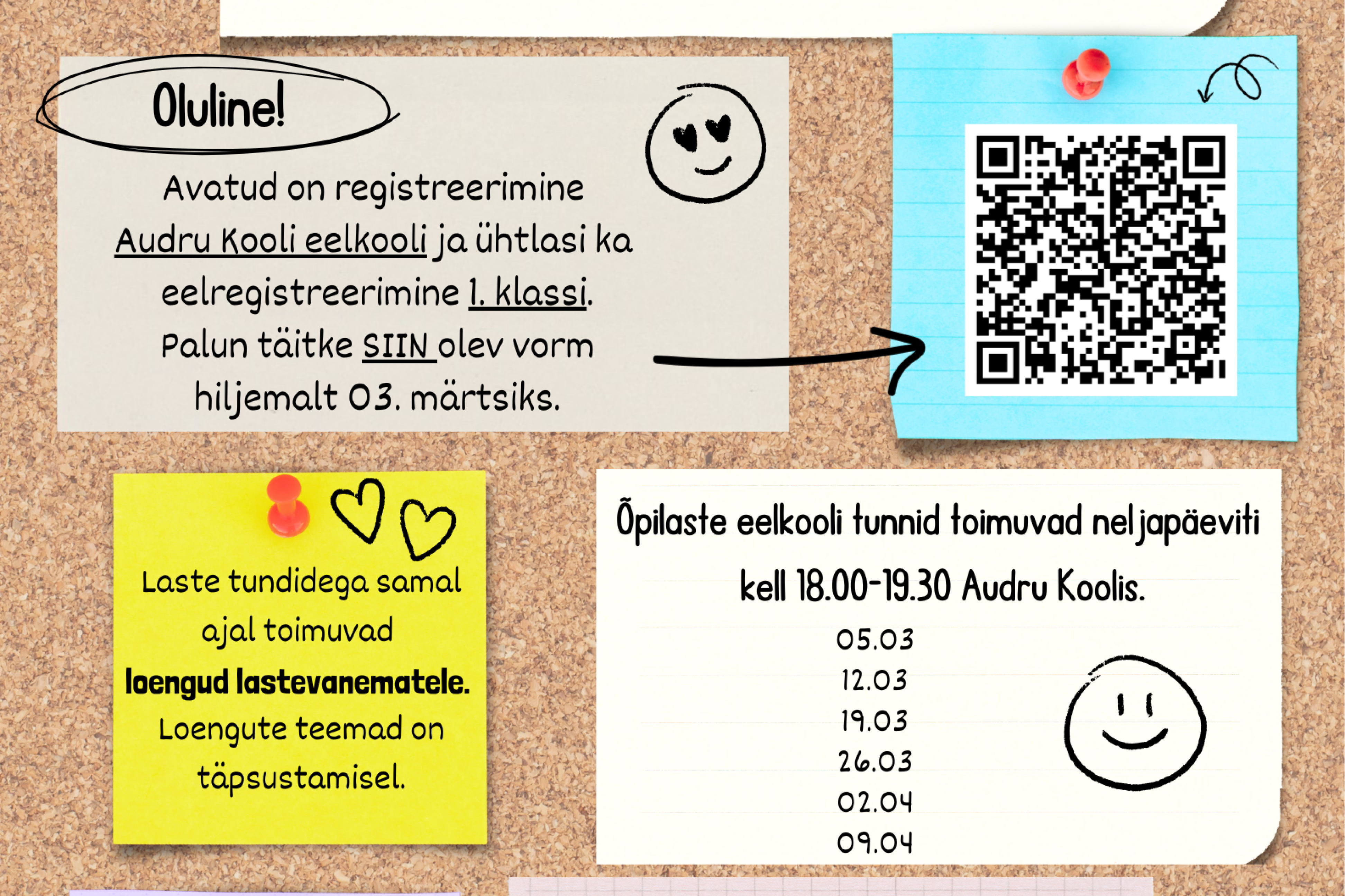 Märtsis alustame taas eelkooliga Audru Koolis. Avatud on registreerimine eelkooli ning ühtlasi ka eelregistreerimine 1. klassi. Eelkooli tunnid toimuvad neljapäeviti kell 18.00–19.30 Audru Koolis. Samal ajal on lapsevanematel võimalus osaleda tasuta loengutes. Palume registreerimisvorm täita hiljemalt 3. märtsiks. Tule koos lapsega ja alusta kooliteed kindla ja rõõmsa sammuga.