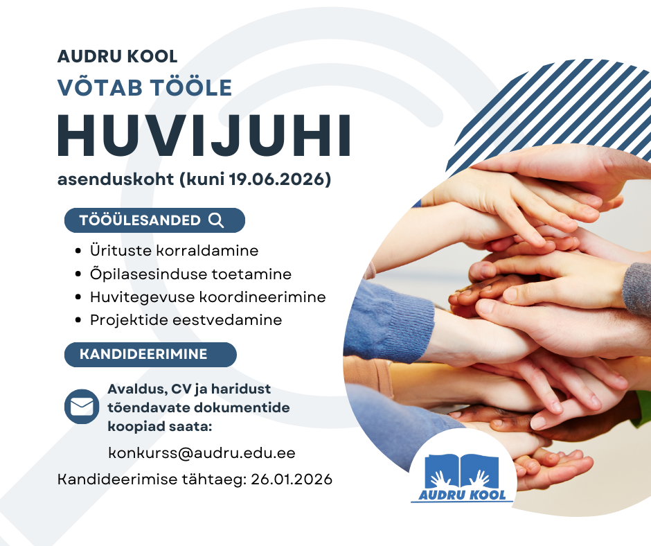 Audru Kool ootab oma meeskonda huvijuhti, kes aitab hoida ja arendada meie koolielu – nii ürituste, õpilasalgatuste kui ka huvitegevuse kaudu. Meie jaoks on oluline, et kool oleks koht, kus lapsed tunnevad end kaasatuna ja saavad julgelt tegutseda.