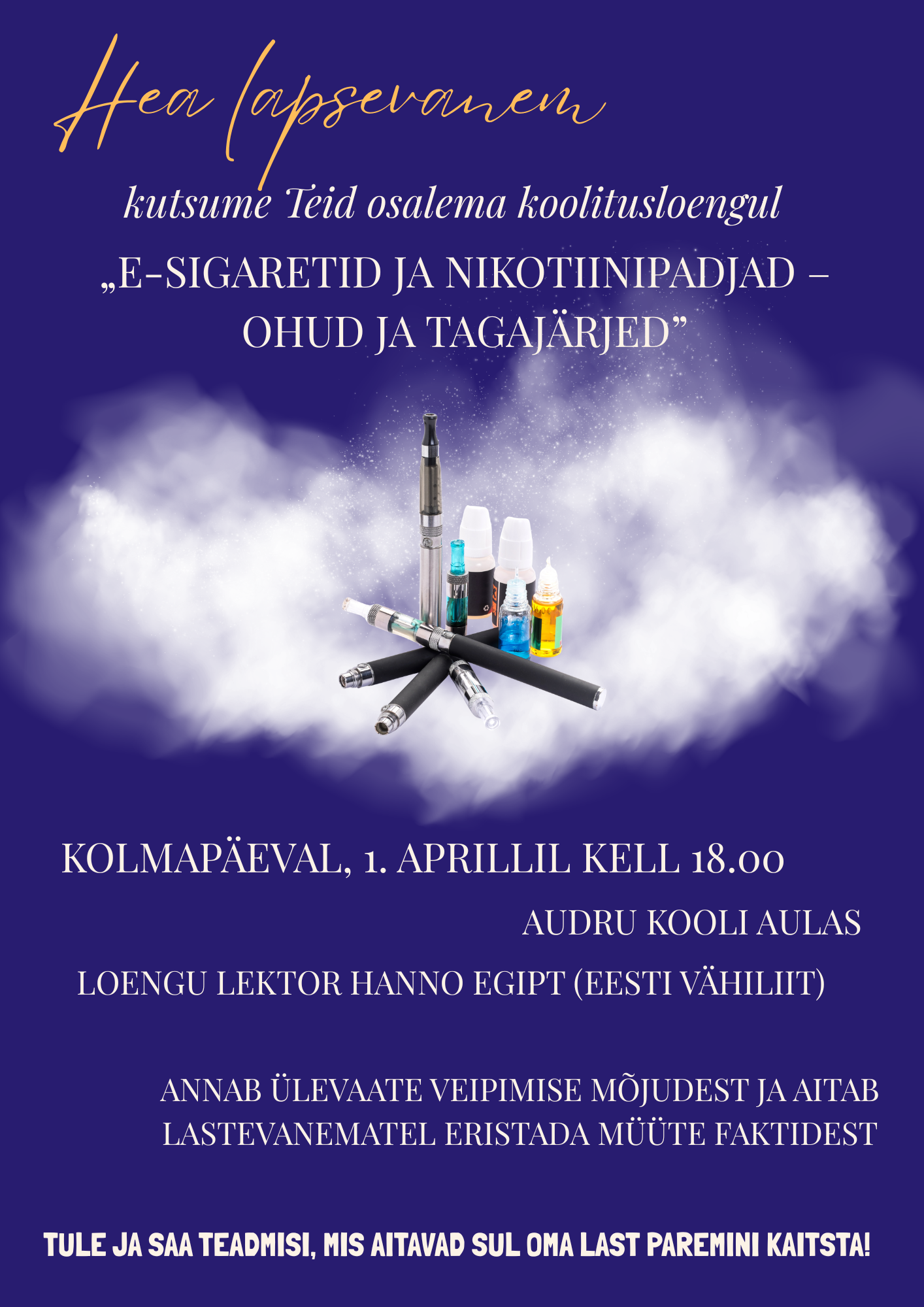 Kutsume teid osalema sel teemal toimuval koolitusel, kus räägime, kuidas e-sigarettide kasutamist ennetada, märke märgata ja noori paremini toetada. Teie mõtted ja küsimused on väga oodatud. Tulge koolitusele ja mõelge koos meiega kaasa – üheskoos suudame oma lapsi paremini hoida.