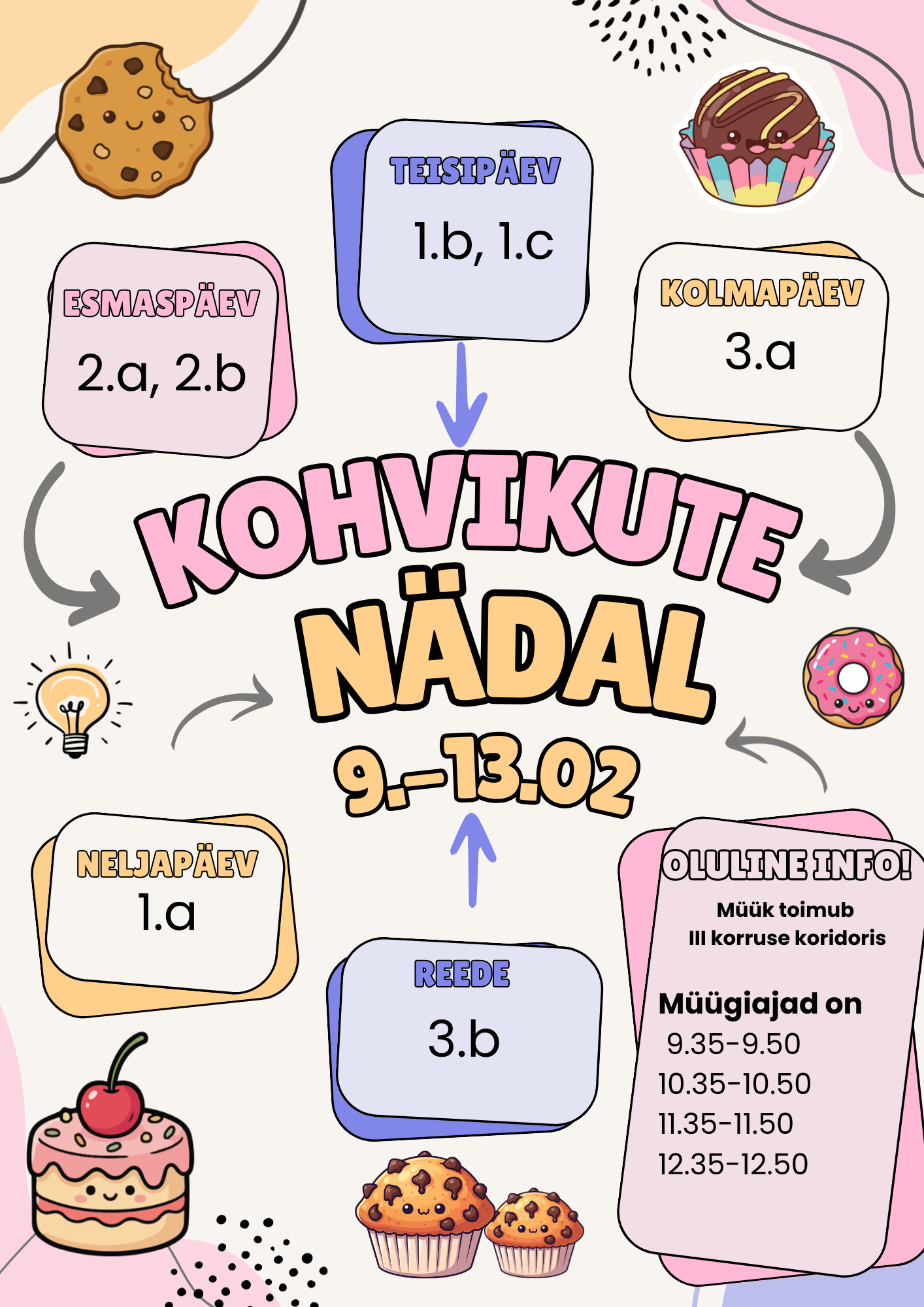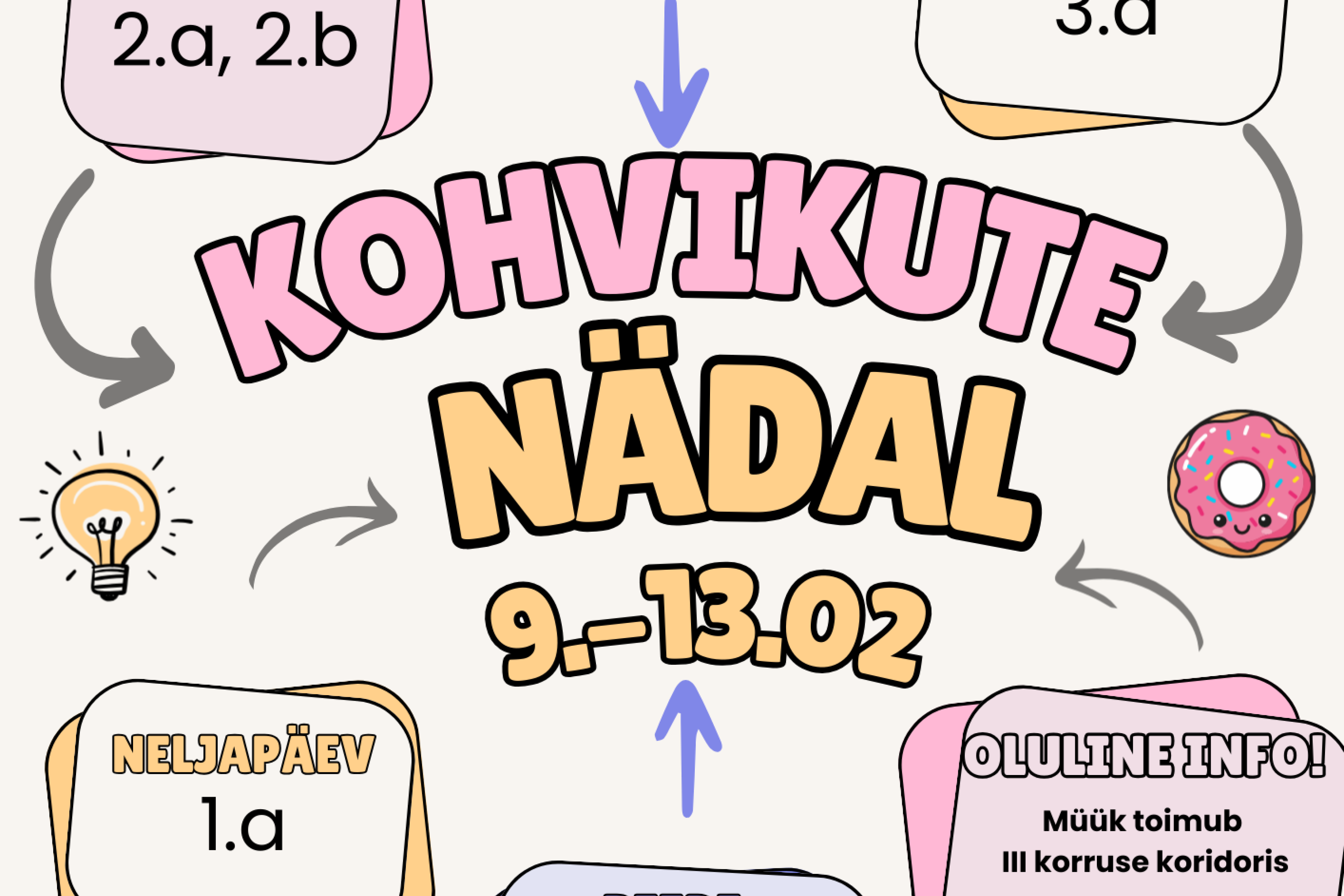 Kohvikute nädal on tulekul ja 9.–13. veebruaril täitub koolimaja mõnusa kohvikumeluga. Vahetundides ootavad teid meie kooli noorimad müüjad oma maitsvate küpsetiste ja heade ideedega. Plakatil kastides olevad klassid näitavad, millised klassid on sel päeval kohvikus müümas. Iga ost on väike, kuid oluline toetus meie noorimatele õpilastele, nende ettevõtlikkusele ja julgele tegutsemisele. Õpilased, astuge läbi, ostke midagi head ja rõõmustage nii ennast kui ka meie kooli väikseid ettevõtjaid.